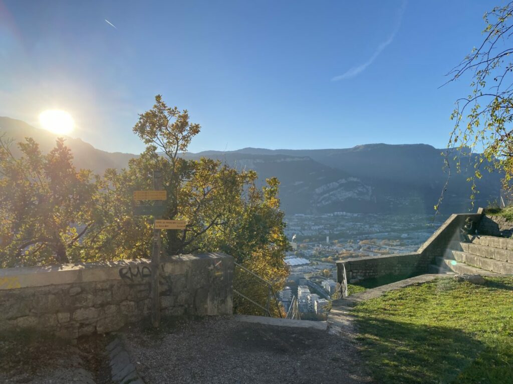 A deux pas du sommet, la vue s’éclaircit, laissant derrière moi l’entièreté de la ville de Grenoble. En cette fin de saison d’été, Grenoble connaît le même rituel: une partie de la ville est plongée dans l’obscurité, l’autre est toujours réchauffée par les derniers rayons de soleil. En redressant ma tête, un paysage éblouissant se dresse devant moi. J’aperçois les couleurs chaudes du soleil se couchant à l’Ouest, derrière les montagnes, et le gris froid du fort qui lui se cache derrière du peu de végétation. Une palette douce et harmonieuse qui apaise instantanément mon esprit, au point de me faire oublier l’épuisement dû à la montée.