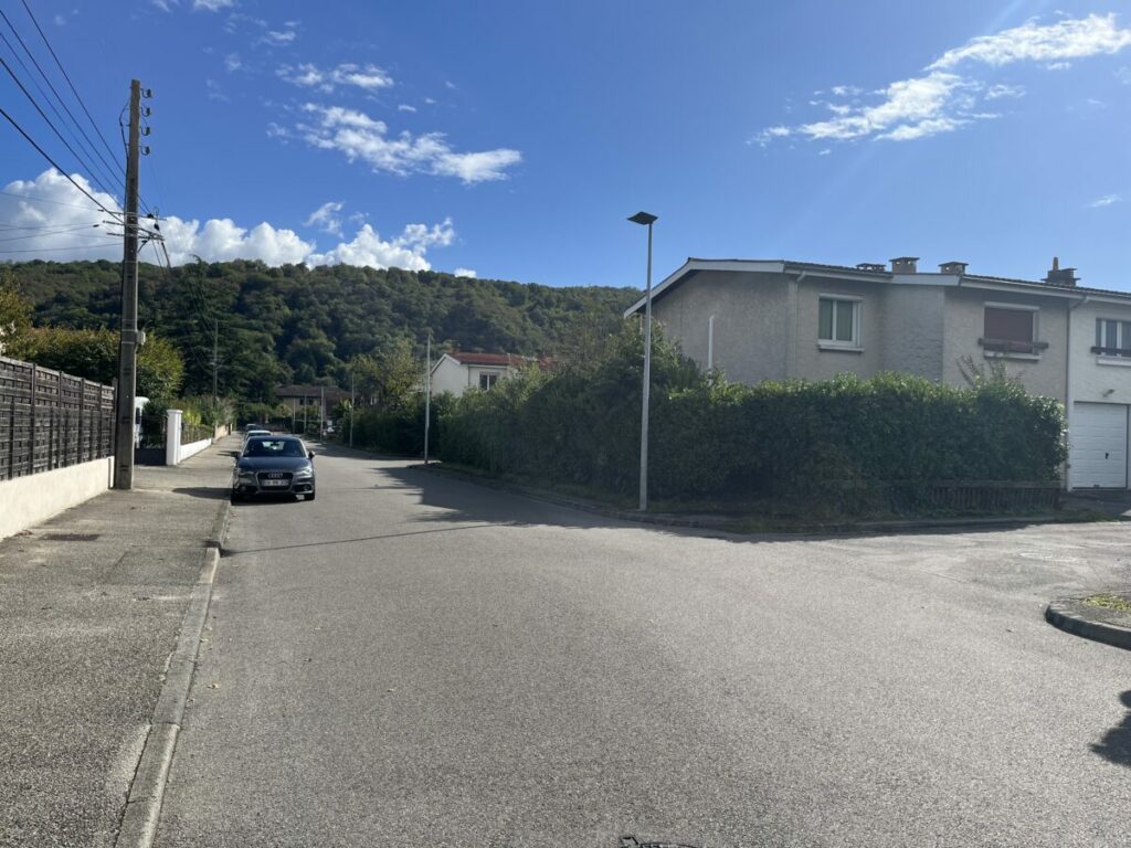 Aux premiers abords, une rue comme une autre — un dimanche après-midi, ciel gris, lumière douce. J’ai posé mon regard comme on poserait une pierre au bord d’un ruisseau : une chaussée craquelée à double sens, des résidences dissimulées derrière de hautes haies de cyprès, et plus loin, vers le sud, une colline boisée qui fermait l’horizon. Vers le nord, le contraste était net : un flux continu de voitures et des immeubles qui se dressaient, de plus en plus hauts.