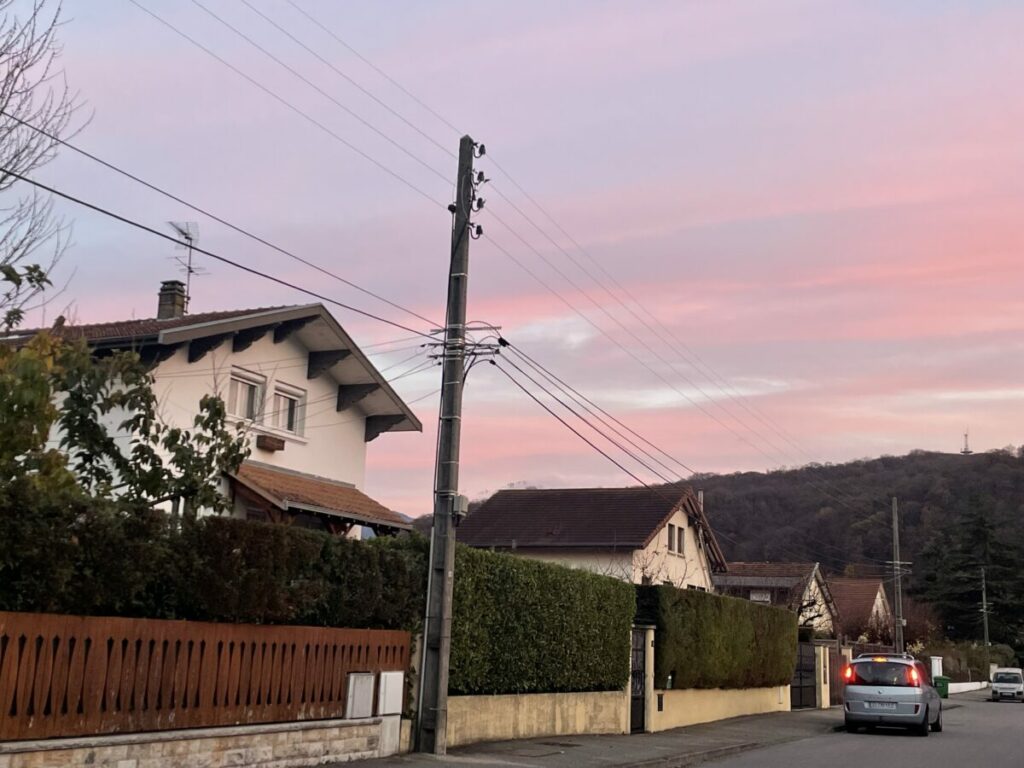 Ce quartier pavillonnaire presque désuet garde quelque chose d’intime, de calme. Les rues sont bordées de haies épaisses et de maisons modestes. Des habitants sortent leurs sacs de courses du coffre de leurs voitures, des étudiants rentrent chez eux, d’autres passants promènent leurs chiens. Je reste là, sur le trottoir, observant ce qu’il se passe autour de moi, je suis spectatrice ce cet espace urbain. Les lampadaires s’allument comme un rituel immuable, remplaçant le soleil. Leur lumière jaune trace un rythme doux, presque apaisant, qui donne envie de rentrer au chaud chez soi.