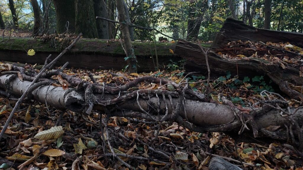 Non loin, un jeune arbre semble enlacer un compagnon tombé au sol, incapable de le relever mais refusant de l’abandonner.