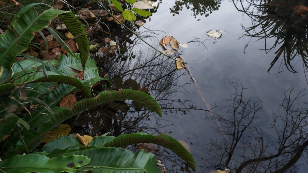 "Entre les fougères et les feuilles flottantes, la forêt s’éteint doucement dans le reflet de l’hiver qui s'approche déjà "