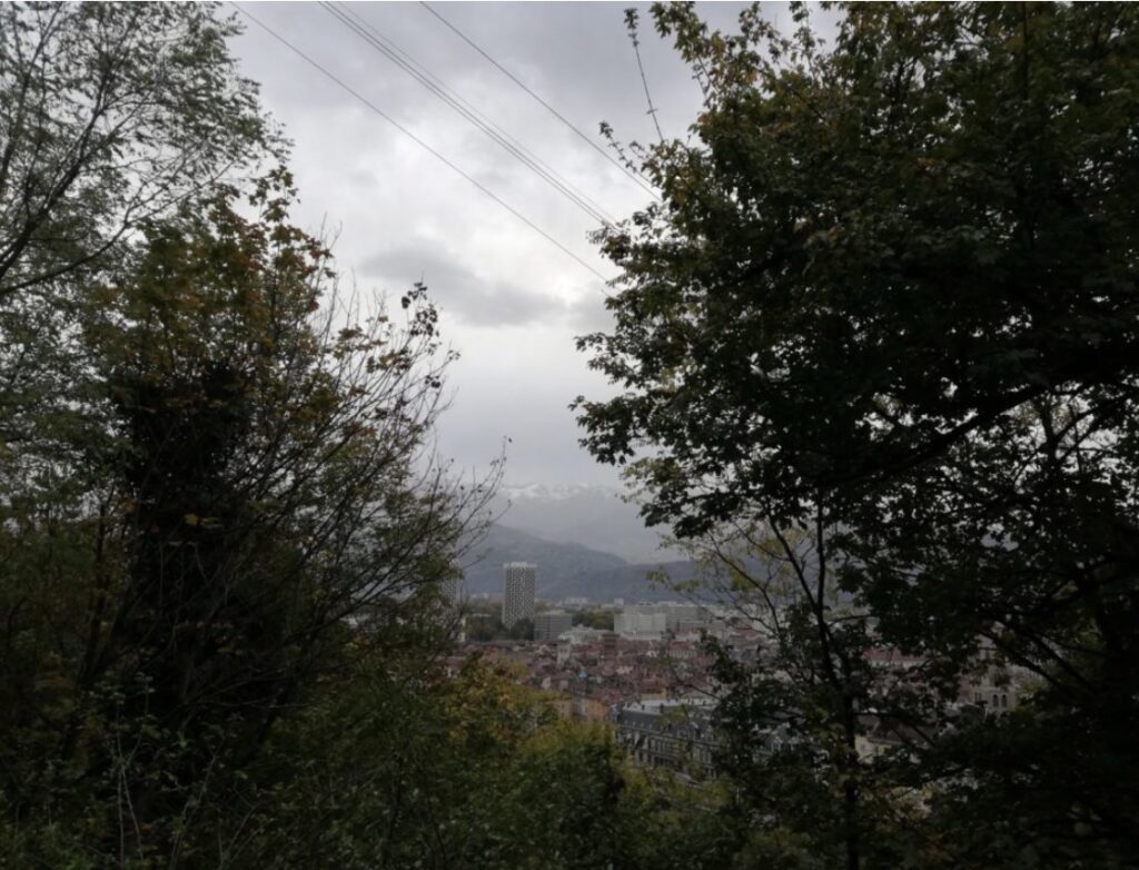 La ville apparaît entre les arbres, fragile sous le ciel gris. Grenoble se dévoile en douceur, prise entre nature, brume et lumière diffuse.