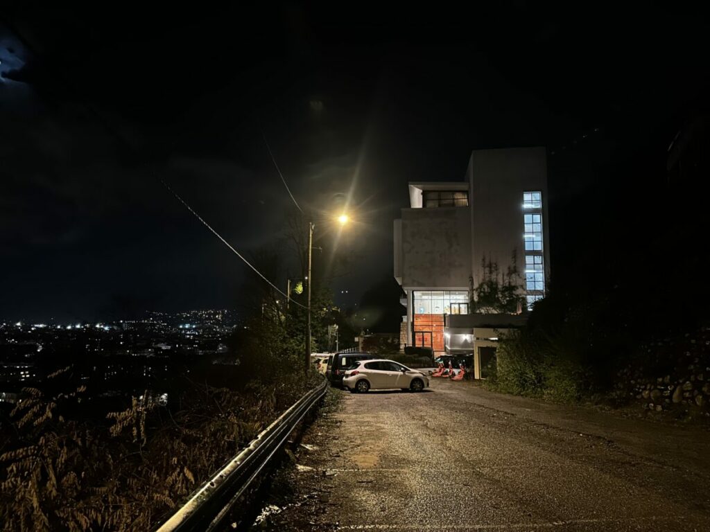 Au bord de la route, la ville scintille au loin. Le lampadaire, la façade éclairée et les ombres dessinent une atmosphère calme et habitée.