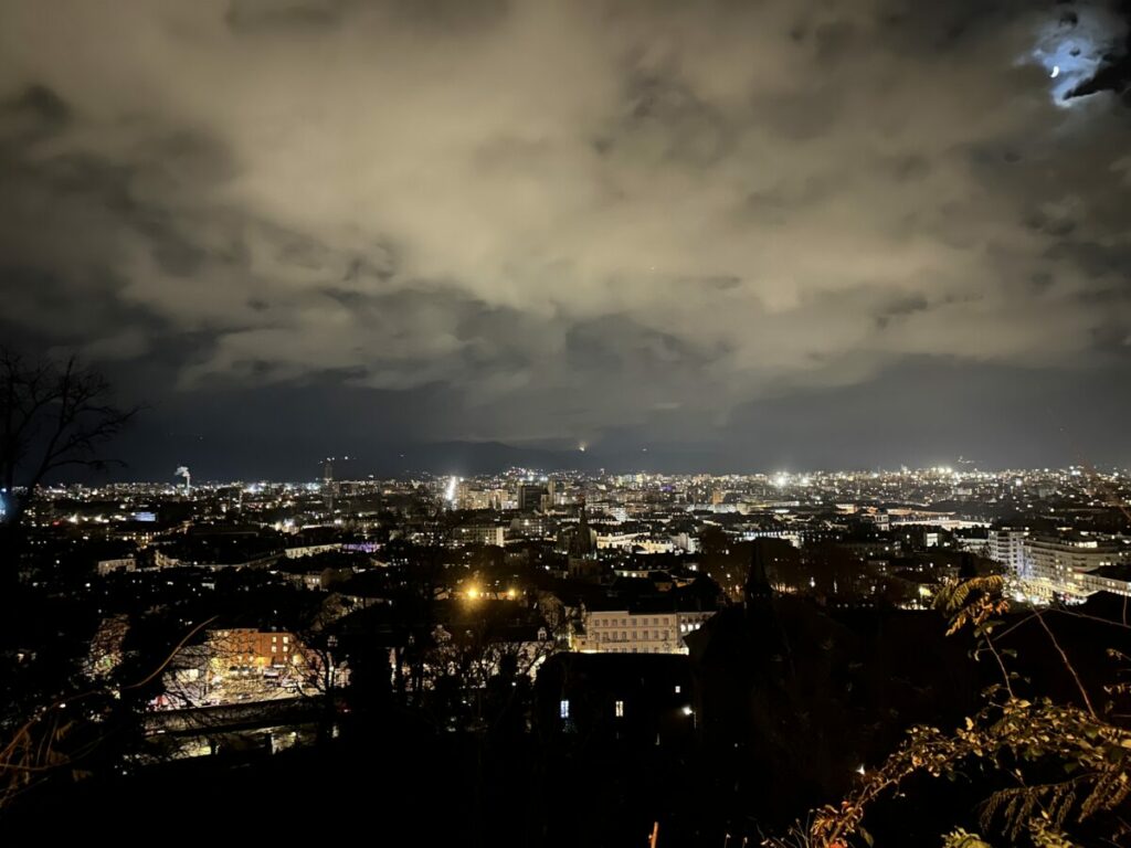La nuit englobe Grenoble : un paysage de lumières, de mouvements et de silence suspendu, où la ville respire sous les nuages.