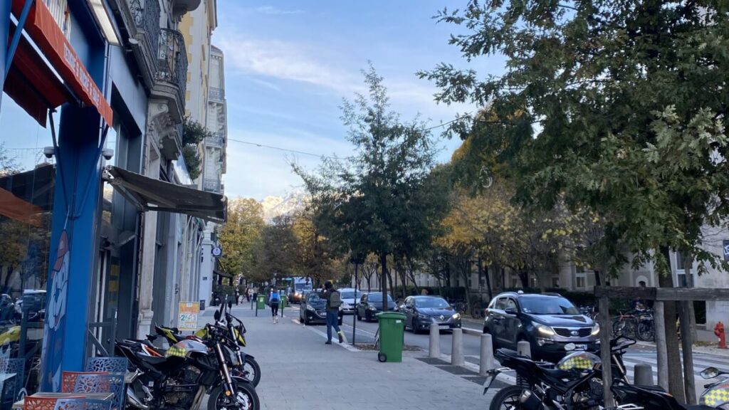 Les sens s’entrecroisent et composent une ambiance vivante : le cliquetis des vélos et le grondement des voitures se superposent, tandis que l’odeur chaude de la boulangerie attire irrésistiblement. En levant les yeux, on aperçoit au loin les montagnes, drapées d’un camaïeu orangé. Le soleil, lui, amorce déjà sa descente, au moment même où ses teintes commencent à se mêler à celles de l’automne.