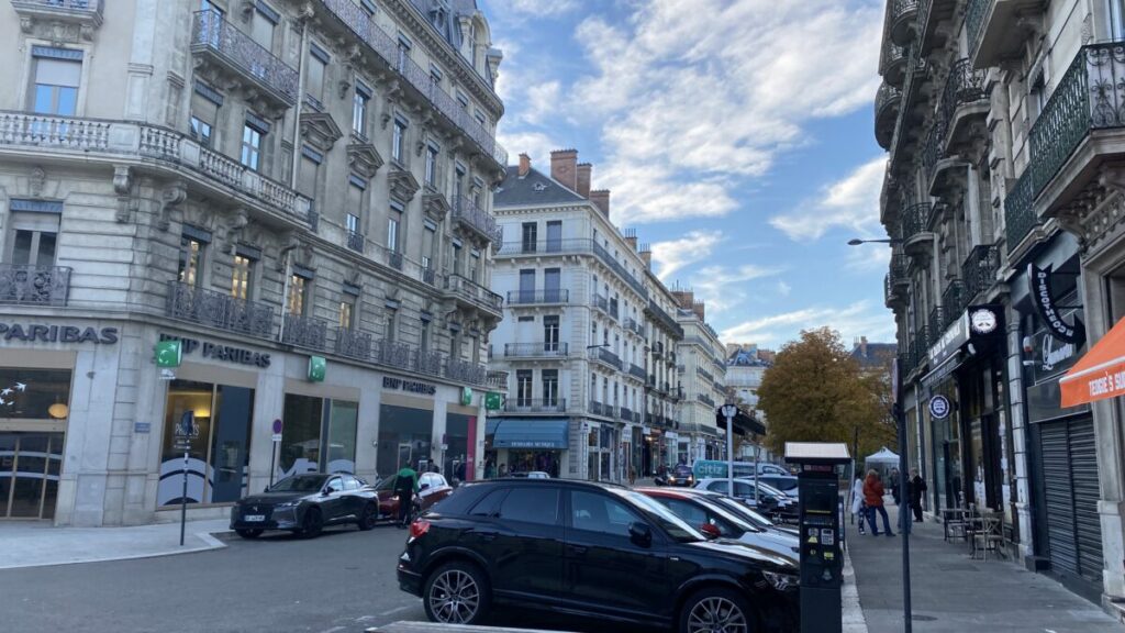 Bien qu’il s’agisse avant tout d’un lieu de passage, l’endroit offre de nombreuses raisons de s’y attarder. On y trouve plusieurs commerces, dont un magasin bio et une boulangerie bordée de larges trottoirs. Ces espaces généreux invitent à s’arrêter un moment pour profiter de l’animation du carrefour. La lumière y est omniprésente : les façades claires et les trottoirs pâles renvoient les rayons du jour et baignent la scène d’une luminosité douce.