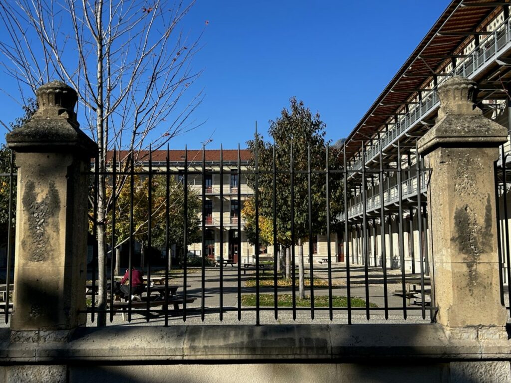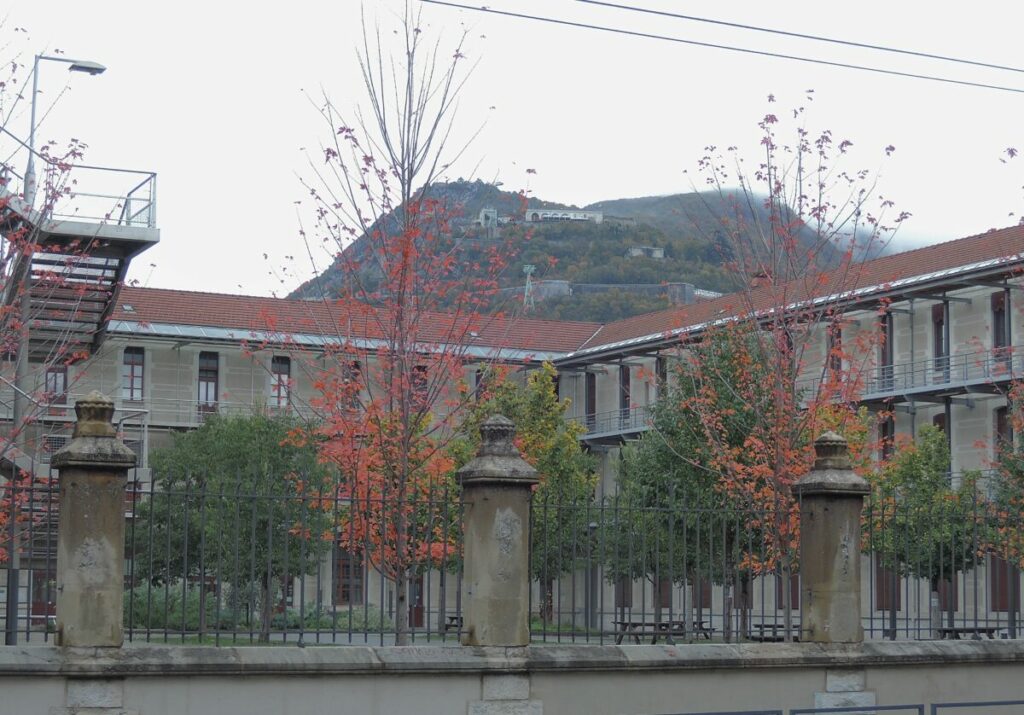 Fin septembre, de l’autre côté de la rue, j’observe la grille du lycée Champollion. Les barreaux fragmentent la vue : dedans la cour, dehors la circulation. Il fait anormalement froid, vent et pluie se frappent aux façades et viennent me fouetter le visage. Les feuilles rouges se détachent sur le beige de l’école, certaines rejoignent le sol, d’autres restent emprisonnées dans le métal mouillé. Au loin, la montagne et la Bastille forment un arrière-plan brumeux. L’odeur des échappements m’empêche de m’envoler complètement. Derrière la grille, la cour vide reste en retrait, protégée mais coupée de ce qui se passe sur le trottoir.