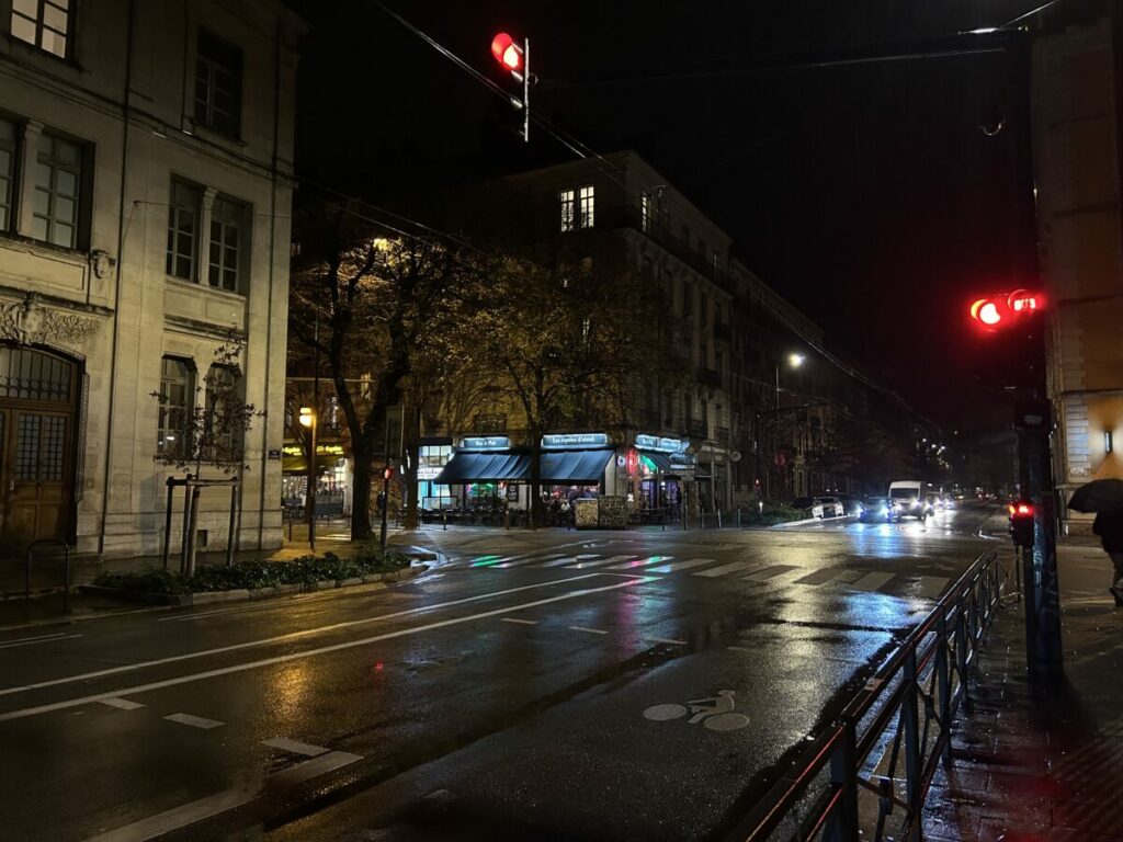 Mi-novembre, je me décale de quelques mètres, côté bar. La nuit tombe tôt, le soleil se cache derrière les nuages pluvieux puis dans l’obscurité. La montagne disparaît dans le noir, remplacée par les lampadaires et les terrasses. La rue s’épaissit de voix, de rires, de portes qui claquent, l’air porte maintenant l’alcool et le tabac. À travers cette même grille, la cour du lycée reste sombre, immobile, traversée seulement par quelques courants d’air. On devine les galeries et les bancs, mais plus aucune présence humaine. La clôture devient une frontière nette entre deux ambiances : l’extérieur animé, bruyant, chaleureux, et l’intérieur silencieux, tenu à distance.