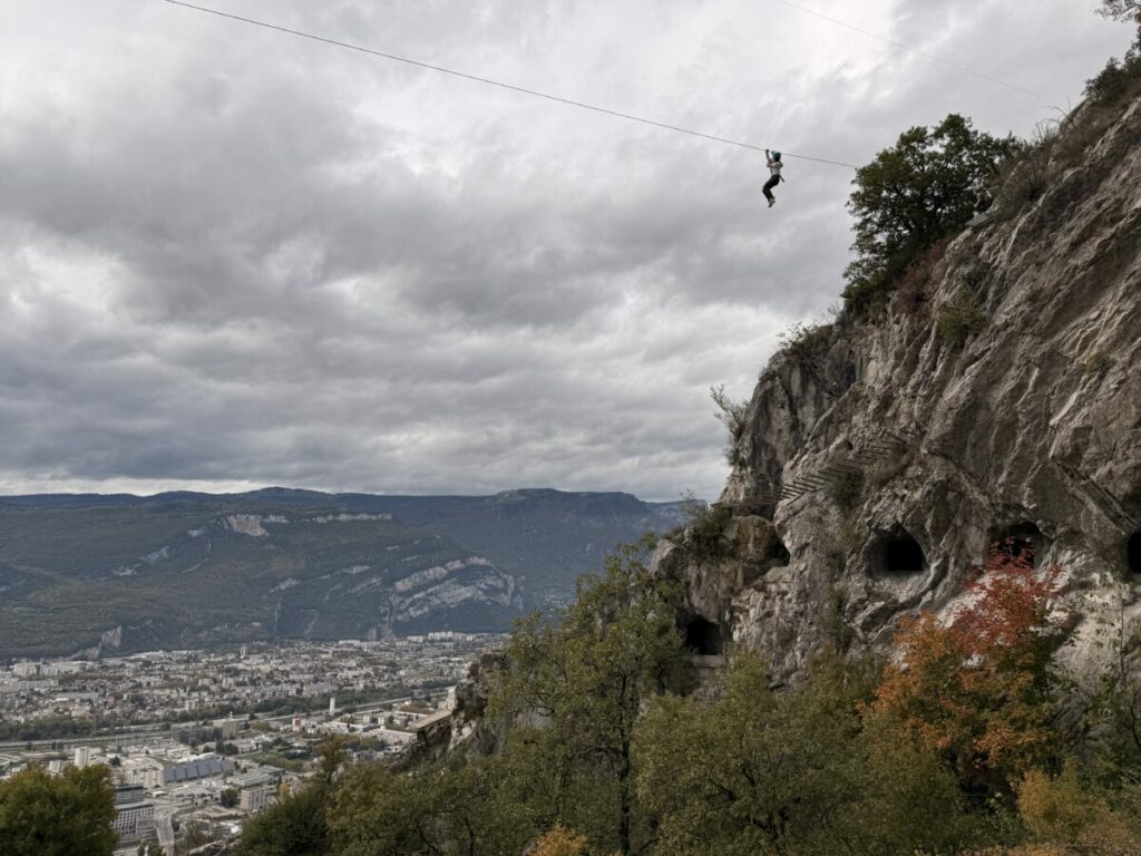 Je me pose sur le côté du chemin. Les personnes se baladent, les enfants courent et jouent, l’espace prend vie. On entend au loin le sifflement d’une tyrolienne qui traverse la vallée. Je me retrouve entre la petite ville en bas, l'immense ciel au-dessus et les montagnes qui m’entourent. C’est une sensation d’équilibre : une rencontre entre l’aventure,la nature, la ville, la hauteur et une paix profonde.