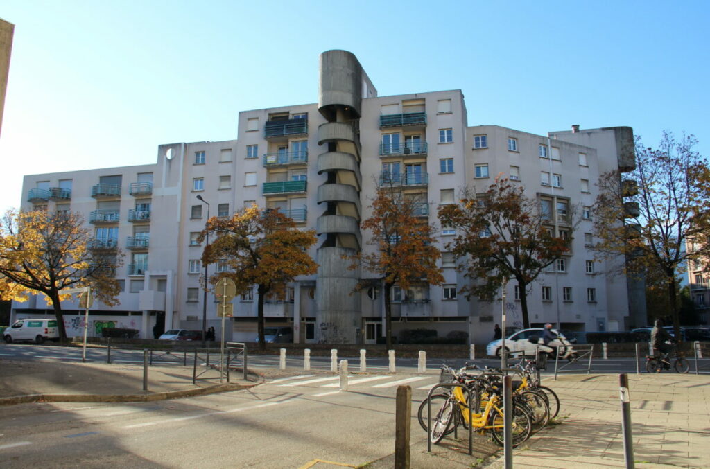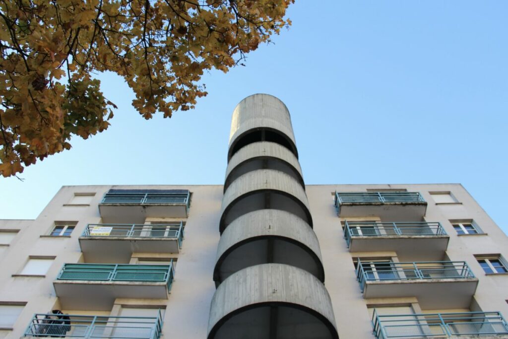 L'immeuble, épousant la courbe de la route, se distingue par ses balcons bleus et son escalier gris et domine l'espace environnant