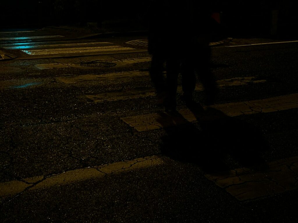 Des pas dans la nuit, saisis au moment où les ombres se croisent.