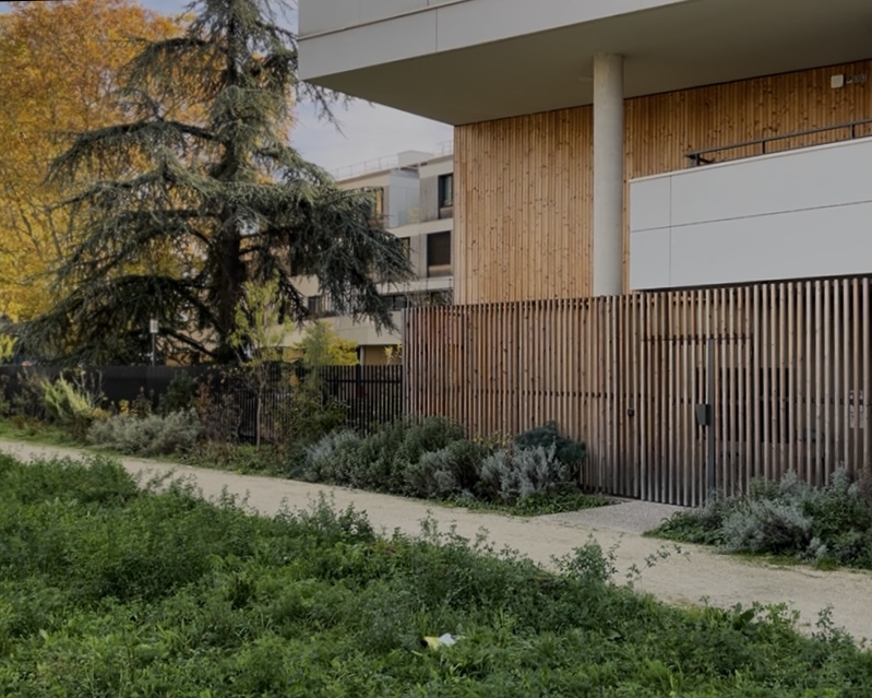 Un chemin silencieux longe l’EHPAD, enveloppé de verdure.