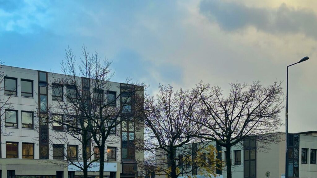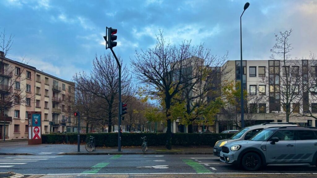 Cette rue est toujours vivante, traversée par un flux constant de voitures, de bus et de vélos. La circulation crée un fond sonore régulier, presque continu, qui remplit l’espace sans jamais devenir agressif.