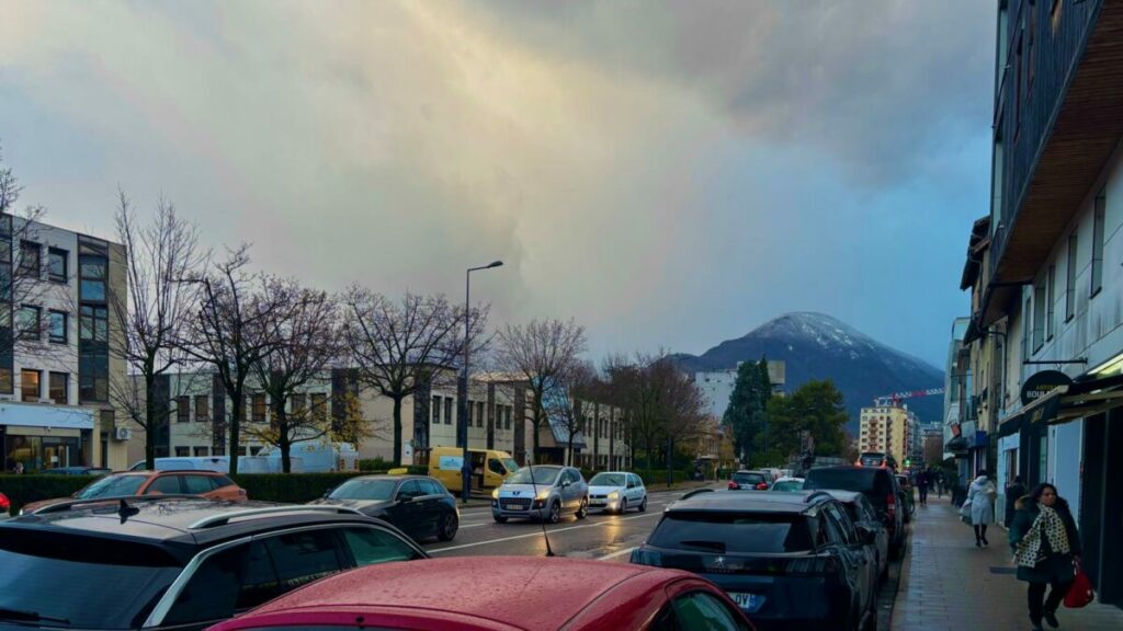 Au-dessus, les arbres bordent la rue et filtrent la lumière du jour, tandis qu’au loin, la silhouette des montagnes ajoute une présence silencieuse.