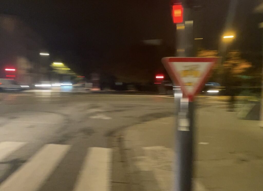Tous les jours, sur le chemin de l’école, mes roues de vélo croisent le bitume ce carrefour hautement fréquenté. Comme toute personne passant par ce croisement, je suis pressée. Le matin je suis pressée pour me rendre en cours, le soir je suis pressée par la fatigue de la journée, je ne regarde pas autour de moi, pas le temps. Pas le temps d’écouter le bruit des moteurs des voitures, les klaxons ou les pigeons qui roucoulent. Pas le temps de sentir le vent me traverser le corps, la pluie ruisseler le long de ma veste ou le soleil me réchauffer la peau. Pas le temps d’observer le jeu de lumière minutieusement organiser par les feux de signalisation, les oiseaux voler, les feuilles mortes tomber ou les montagnes changer au fil de la météo. Pas le temps de remarquer qu’il n’y a rien à voir, que les trois magasins qui se cours après sont fermés, que les façades des habitations sont abimées par le temps, que le sol est fissuré ou que le peu de biodiversité présente se meurt.
