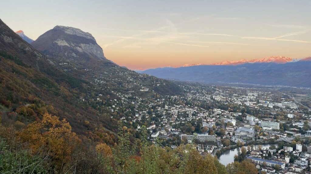 Arrivée en haut, je suis accueillie par des lumières chaudes qui me procurent un sentiment de plénitude. Le soleil décline derrière le Vercors, et la ville s’illumine. Après une longue journée de cours, il s’offre à moi comme une récompense. Le ciel est pur, pas un nuage. Un coureur passe, puis un autre, figures pressées dans cette douceur du soir. Désormais, on ne voit plus que la silhouette des montagnes. Un grand espace s’ouvre à moi, la vue n’est plus limitée par les immeubles. En tendant l’oreille, les piaillements des oiseaux se mêlent au brouhaha de la ville : des voitures, une ambulance, un hélicoptère... La Bastille est un refuge, ici rien ne peut nous atteindre. Loin de la ville, je peux reprendre mon souffle. Soudain, deux chiens me surprennent, me tirant de ma rêverie.