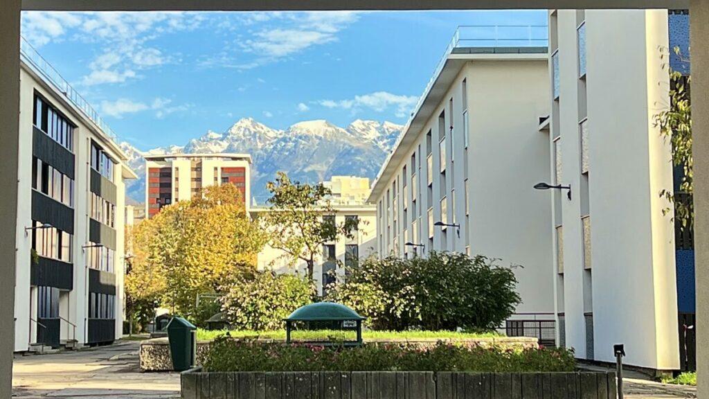 À travers les escaliers, on aperçoit des montagnes enneigées dont les sommets scintillent sous les rayons dorés.